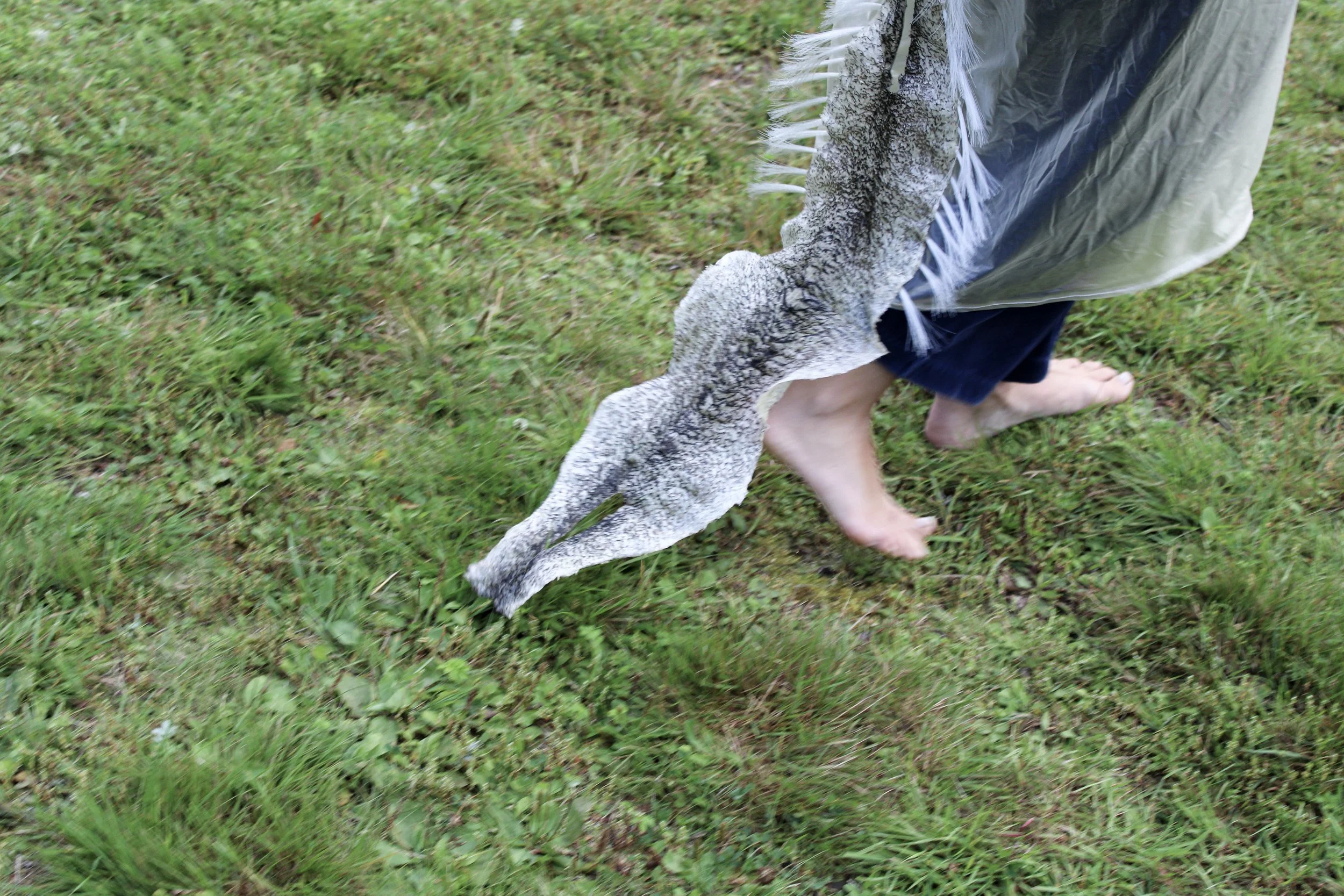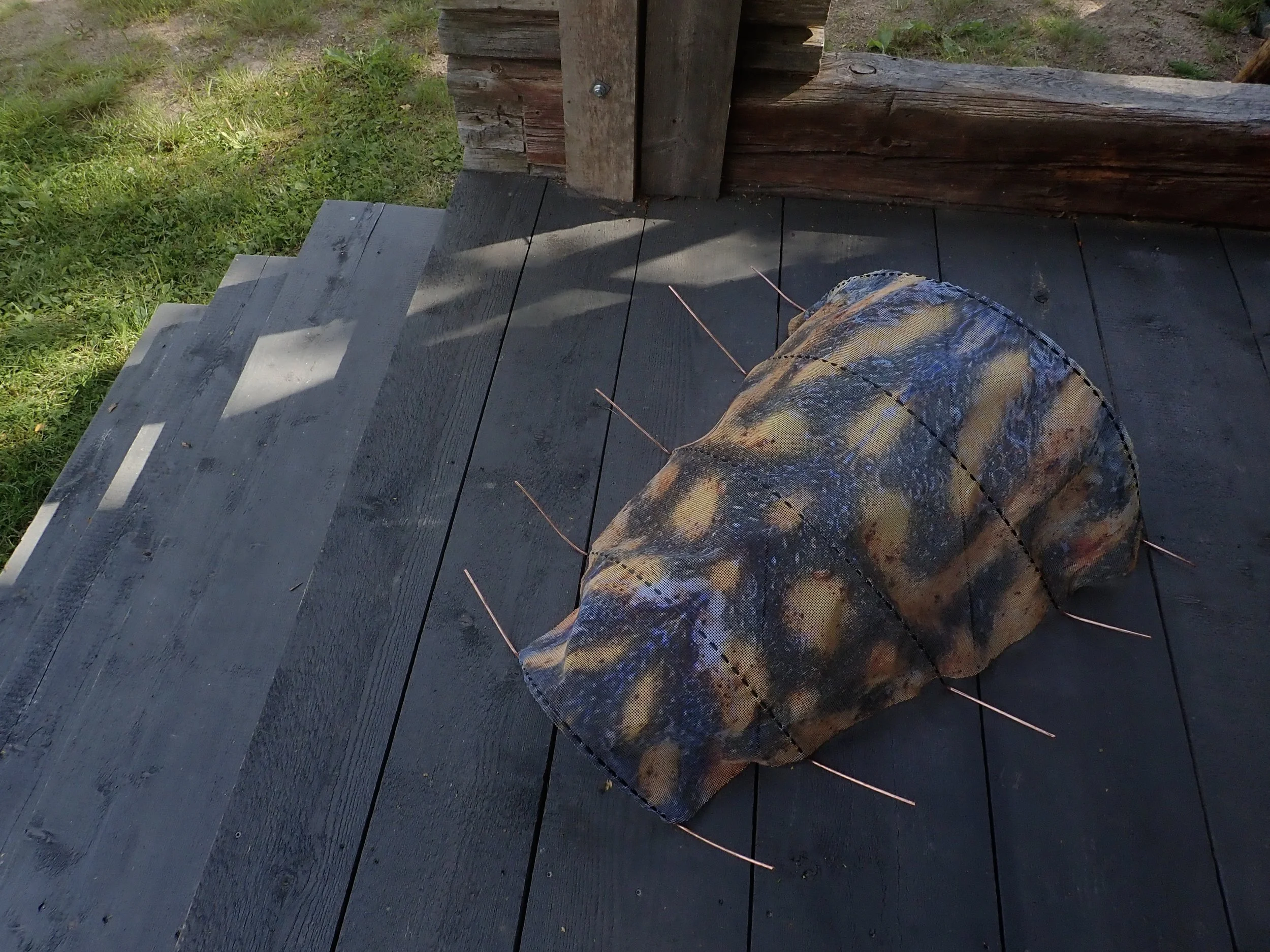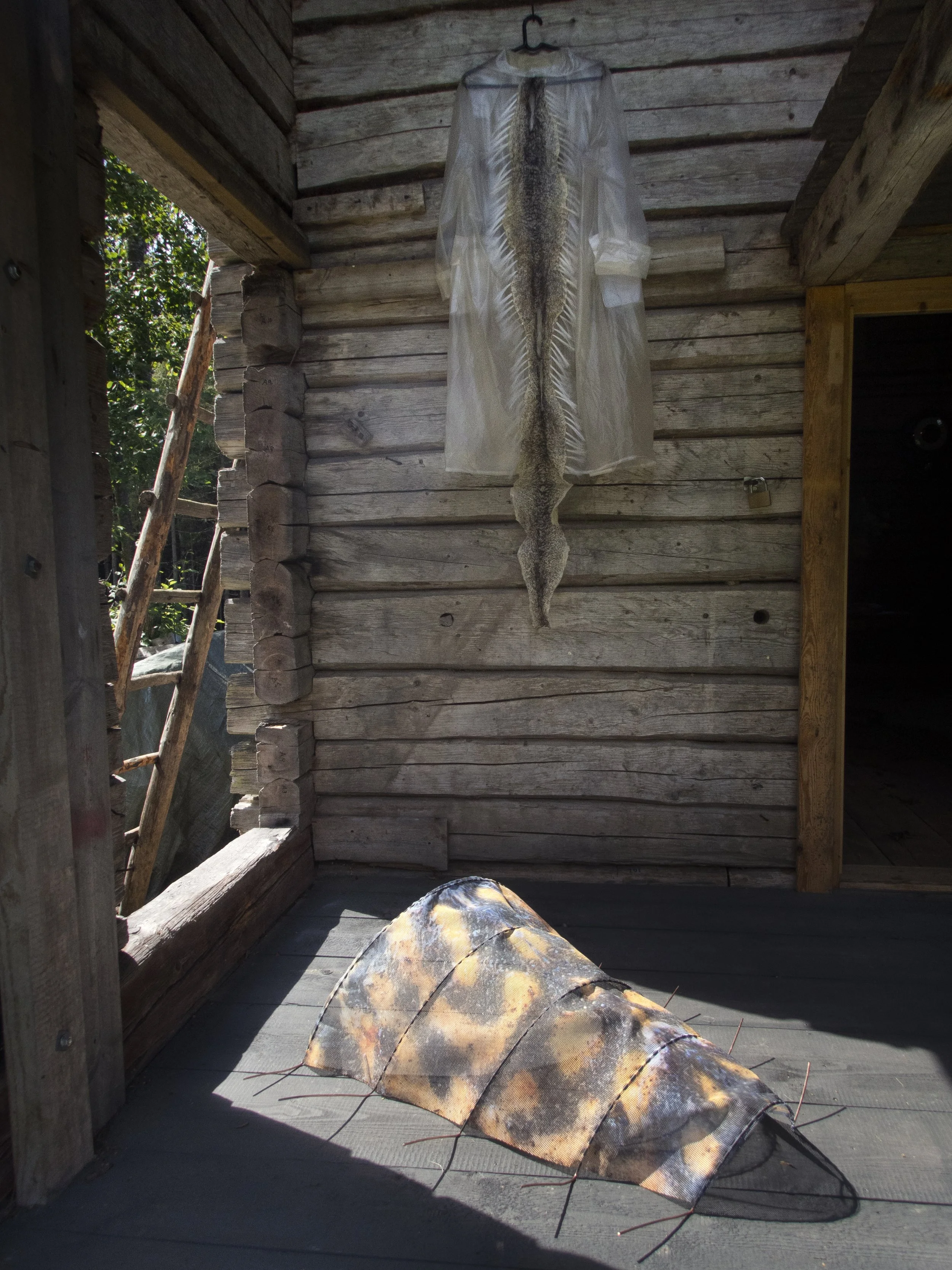 tanned pikeskin, fishing line, transparent raincoat